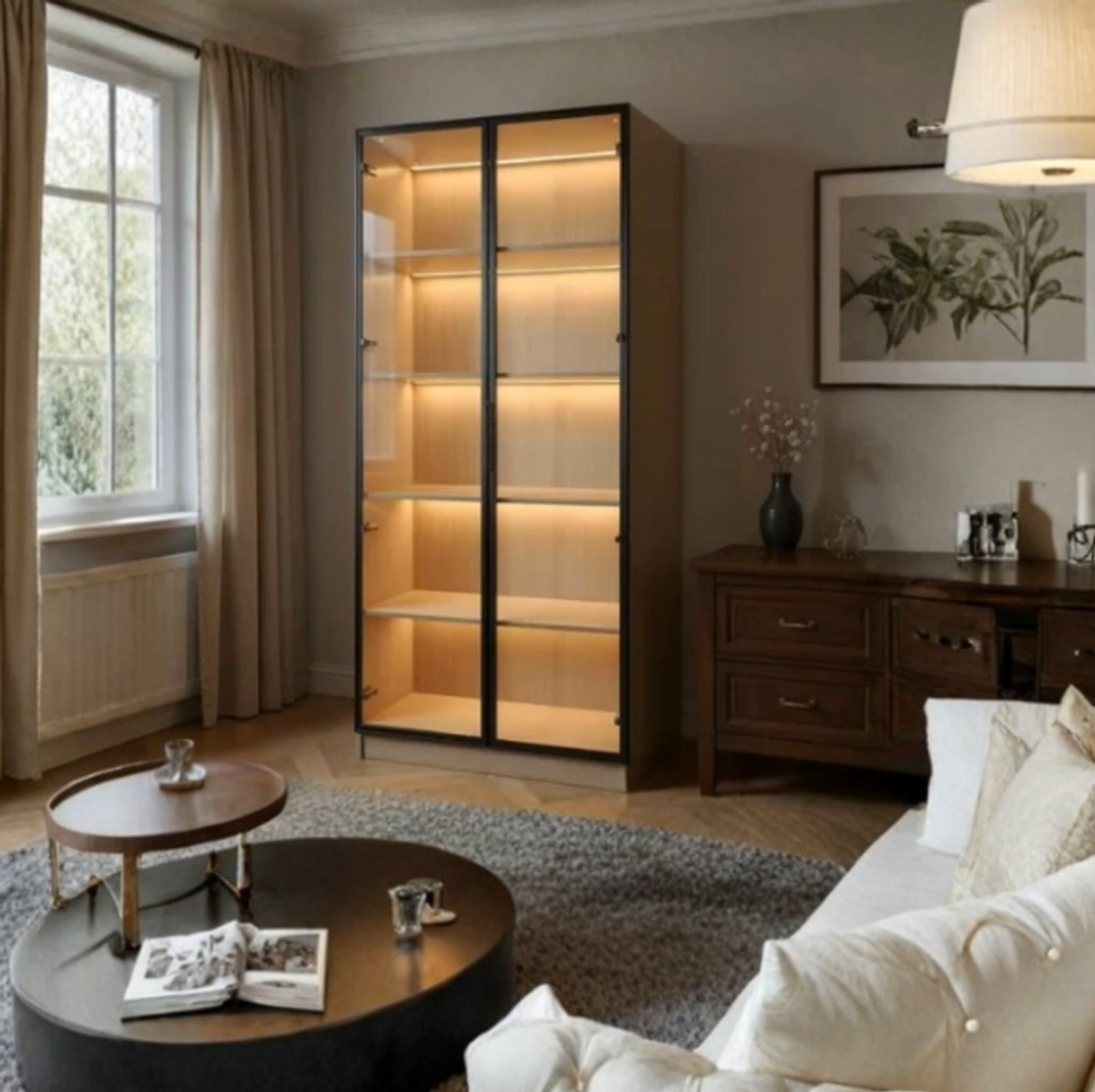 - Elegant Double Glass Doors: The two glass doors with sleek frames provide a clear view of the cabinet's contents, allowing you to beautifully display your cherished items.